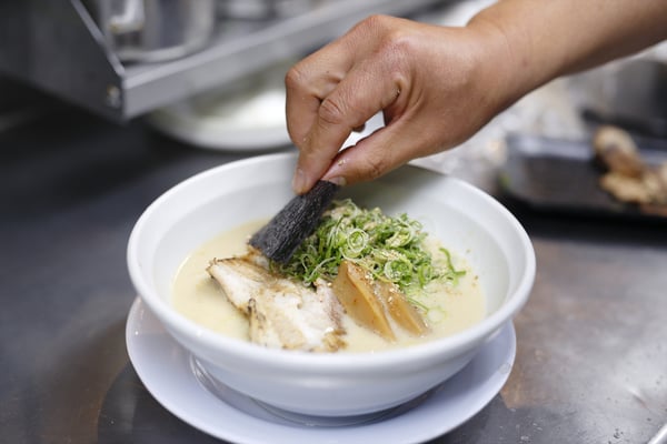 こうして出来た濃厚な豚骨スープに鶏ガラを加えてさらに煮込み、食べやすくマイルドな味に仕上げました。スープは濃厚でコクがあり、そして豚骨特有の臭みがありません。